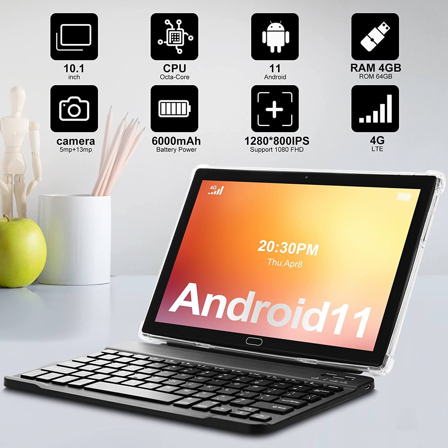 • 【More than a Tablet 】4G LTE phone tablet Comes with Bluetooth Keyboard, Pen, Wireless Mouse and foldable protective case, it can flexibly turn tablet into a laptop and smartphone mode, make it 2 in 1 Tablet.